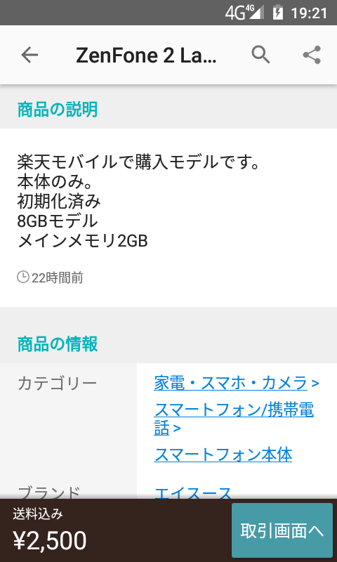 g06+ではau回線をつかめないことが判明したため、ZenFone 2 Laserを中古で2500円で購入しました。